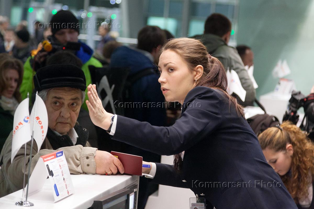 Тестовая эксплуатация нового терминала-1 аэропорта "Пулково". Пассажиры у стойки регистрации.