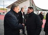 Министр спорта России Виталий Мутко (слева) и тренер по футболу Евгений Ловчев (справа) во время церемонии открытия памятника футболисту, бывшему нападающему ФК "Спартак" Федору Черенкову рядом со стадионом "Открытие Арена".