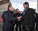 Вице-президент нефтяной компании "Лукойл" Леонид Федун (слева) и министр спорта России Виталий Мутко (справа) во время церемонии открытия памятника футболисту, бывшему нападающему ФК "Спартак" Федору Черенкову рядом со стадионом "Открытие Арена".