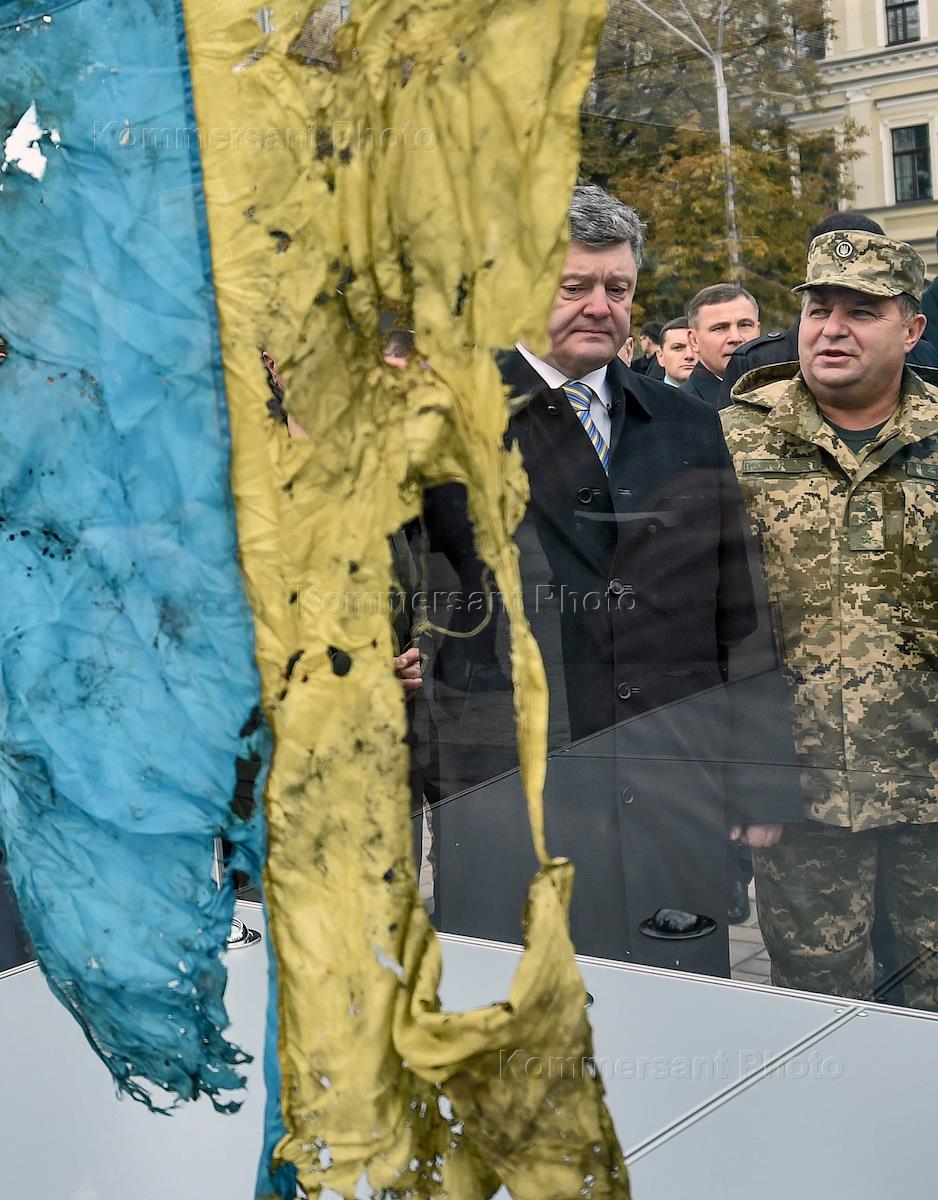 Президент Украины Петр Порошенко (слева) и Министр обороны Украины генерал-полковник Степан Полторак (справа) в День защитника Украины принял участие в торжественном открытии выставки военной техники "Сила непокоренных", которая стартовала на Михайловской площади в Киеве.