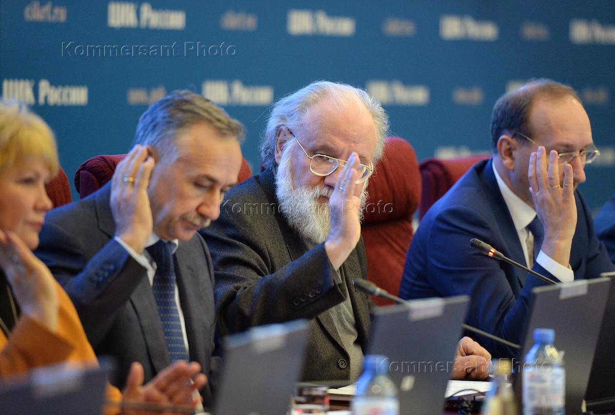 Слева направо: председатель Центральной избирательной комиссии (ЦИК) России Владимир Чуров, заместитель председателя ЦИК России Леонид Ивлев и секретарь ЦИК России Николай Конкин во время заседания Центральной избирательной комиссии России.