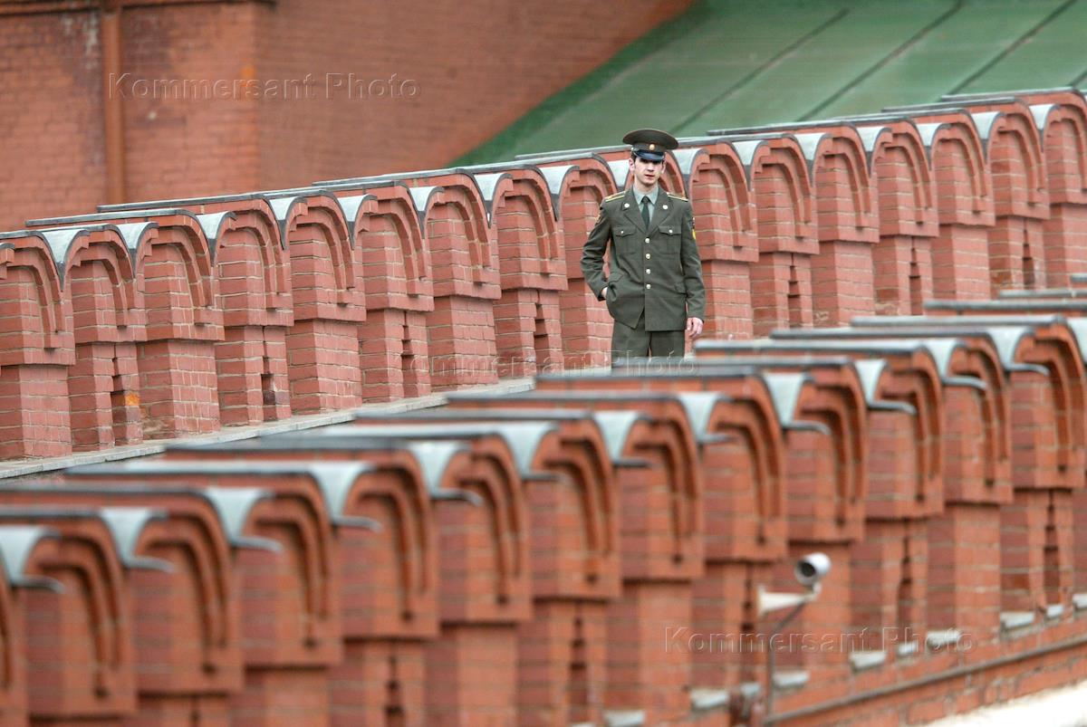 A soldier of the Presidential Regiment walks atop the Kremlin wall.