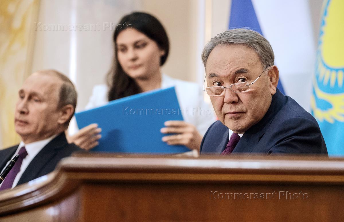 Рабочая поездка президента России Владимира Путина в Казахстан. Президент России Владимир Путин (слева) и президент Казахстана Нурсултан Назарбаев (справа) во время российско-казахстанских переговоров.
