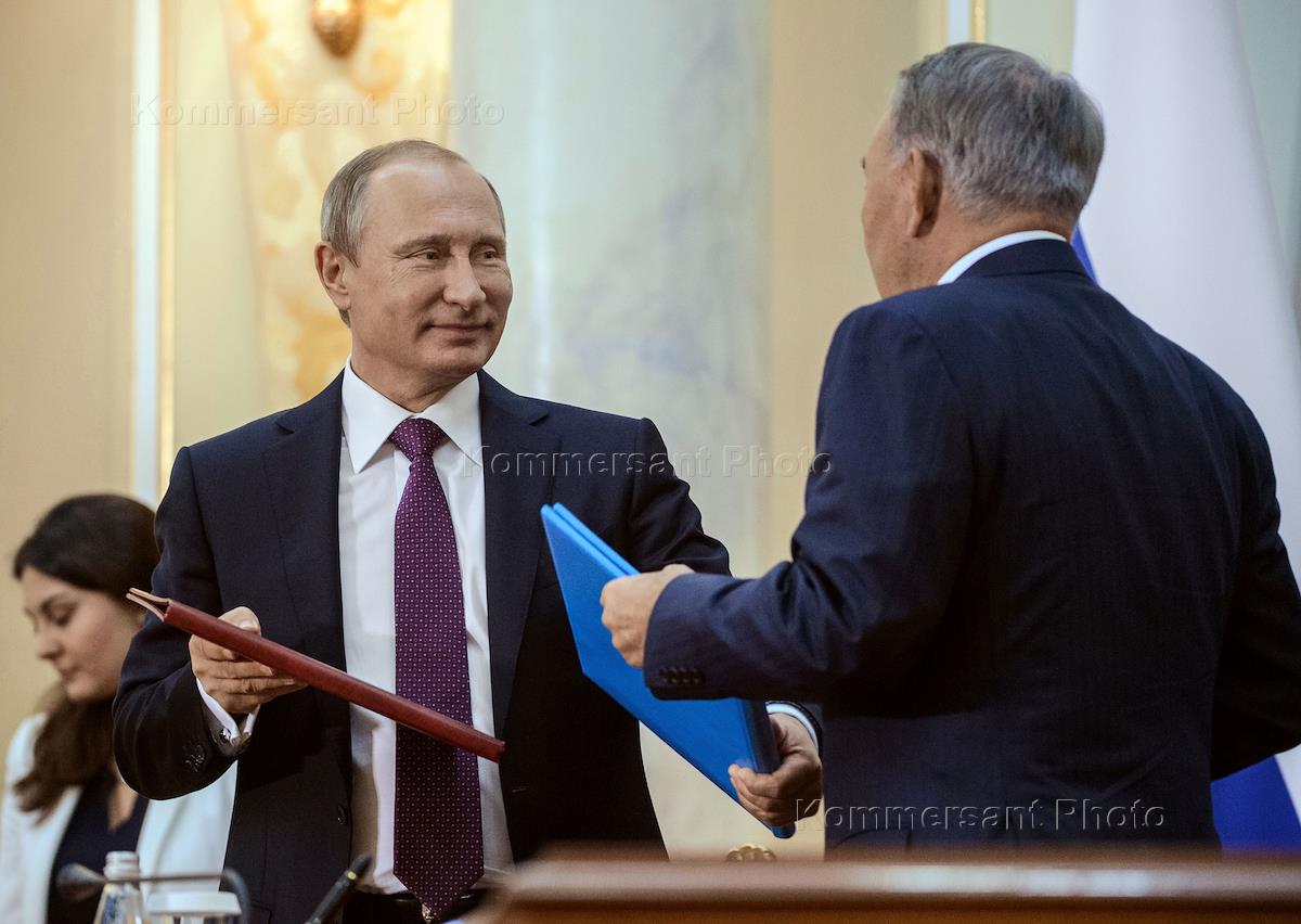 Рабочая поездка президента России Владимира Путина в Казахстан. Президент России Владимир Путин (слева) и президент Казахстана Нурсултан Назарбаев (справа) во время российско-казахстанских переговоров.