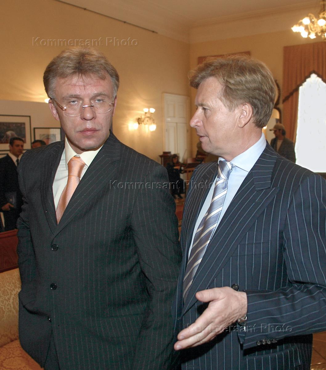 Chairman of the Russian State Sports Committee (Goskomsport) Vyacheslav Fetisov (left) talks to the Russian Olympic Committee Leonid Tyagachev (right) during the signing of co-operation agreement between Goskomsport and privately-owned 7TV channel. The event took place in the Unions House.