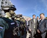 Визит президента Украины Петра Порошенко в Одессу. Председатель Одесской областной государственной администрации Михаил Саакашвили (второй справа) и президент Украины Петр Порошенко (справа) во время общения со служащими нового правоохранительного подразделения спецназа на площади возле здания областной государственной администрации.