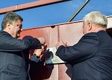 Рабочий визит президента Украины Петра Порошенко в Николаевскую область. Президент Украины Петр Порошенко (слева) во время посещения судостроительно-судоремонтельного завода "НИБУЛОН", где принял участие в мероприятиях по возрождению судоходства по реке Южный Буг.