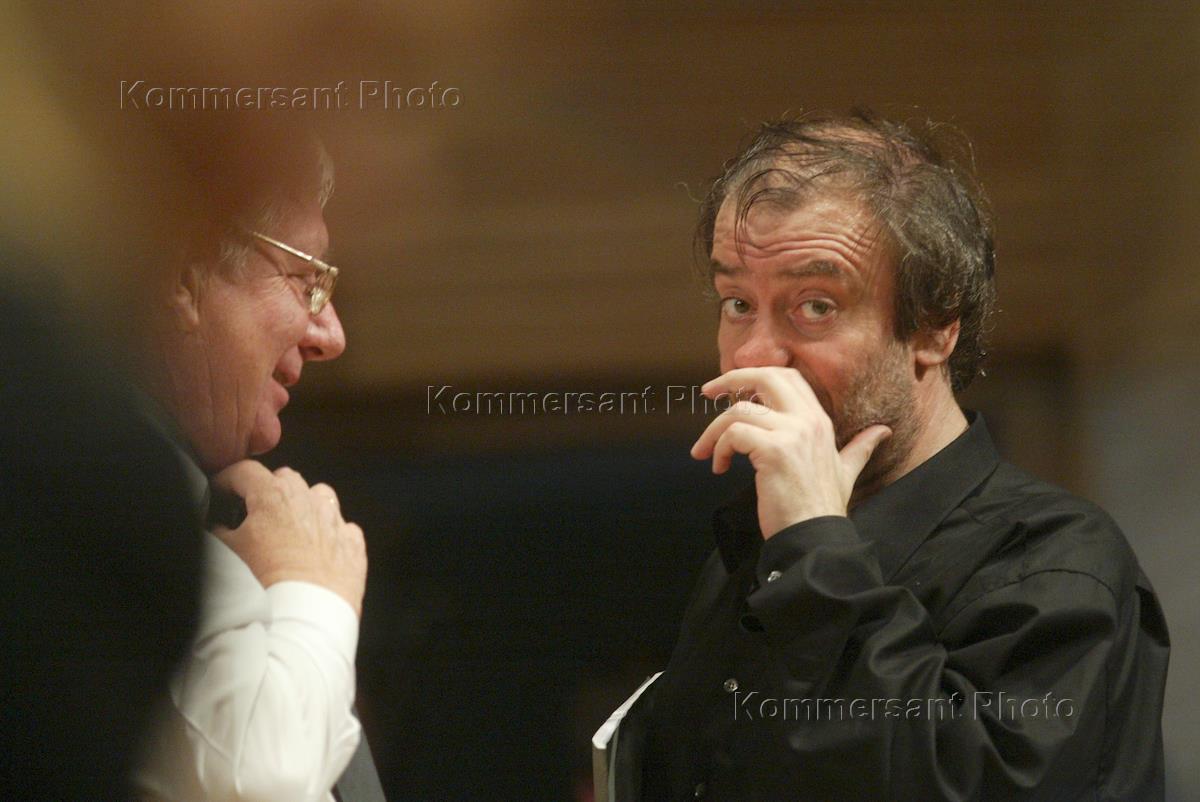 Russian music conductor Valery Gergiyev talks to an unidentified musician after the concert given at the closure of the Easter Festival, which was held in the Music House.