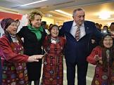 Председатель Совета Федерации России Валентина Матвиенко (в центре) с участницей ансамбля "Бурановские бабушки" в холле Совета Федерации России.