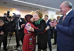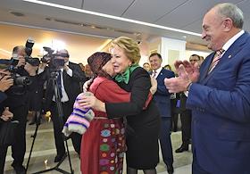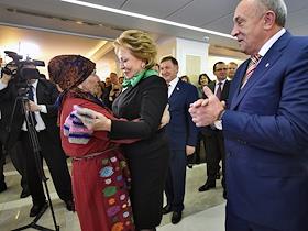 Председатель Совета Федерации России Валентина Матвиенко (в центре) с участницей ансамбля "Бурановские бабушки" в холле Совета Федерации России.