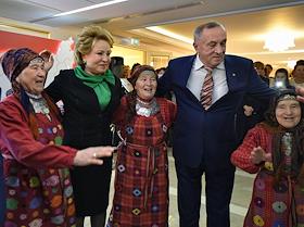 Председатель Совета Федерации России Валентина Матвиенко (справа) с участницами ансамбля "Бурановские бабушки" в холле Совета Федерации России.