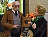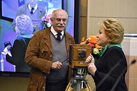 Председатель Союза кинематографистов России, режиссер Никита Михалков (слева) и председатель Совета Федерации России Валентина Матвиенко (справа) на заседании Совета Федерации России.