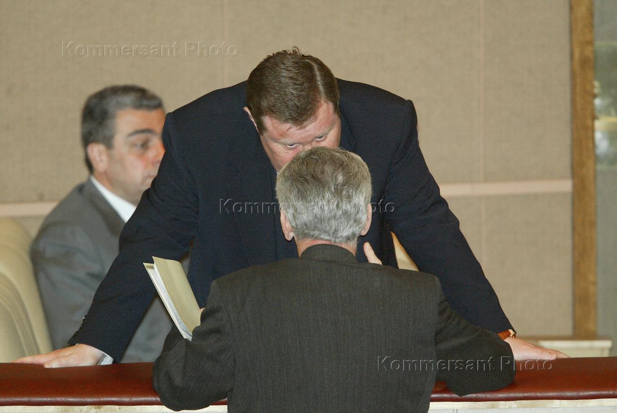 Russian Prosecutor General Vladimir Ustinov talks to an unidentified legislator during a session of the State Duma.