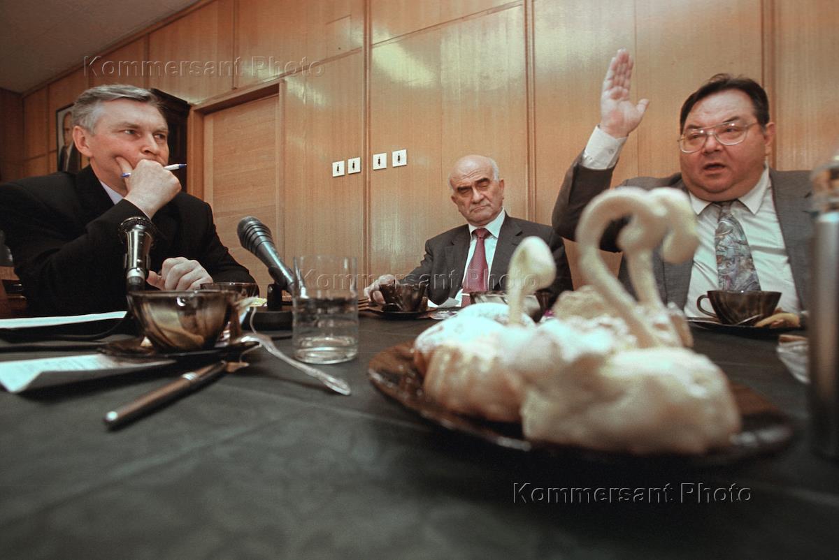 Russian Education Minister Vladimir Filippov (left) runs the so-called 'parents meeting', summoned to discuss pressing issues in the national education system. The meeting was attended by representatives of schoolchildren parents associations, and heads of some of the leading Russian higher education institutions - president of the High School of Economics Yevgeny Yasin (centre) and president of the Russian Art Academy Nikolay Petrov (right).