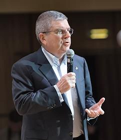 Президент Международного олимпийского комитета Томас Бах во время спортивного праздника в рамках спортивно-образовательного проекта Олимпийского комитета России "Олимпийский патруль". Праздник прошел в Московском дворце пионеров.