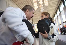 Двукратная олимпийская чемпионка по фехтованию Карина Азнавурян (слева) и президент Международного олимпийского комитета Томас Бах (справа) во время мастер-класса по фехтованию в Московском дворце пионеров.