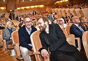 Модельер Вячеслав Зайцев (слева) на творческом вечере "Территория любви. Сентиментальное путешествие по фильмам Никиты Михалкова через музыку Эдуарда Артемьева" в Московском международном Доме музыки.