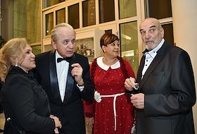 Актер Евгений Стеблов (слева) и актер Станислав Любшин (справа) с супругой на творческом вечере "Территория любви. Сентиментальное путешествие по фильмам Никиты Михалкова через музыку Эдуарда Артемьева" в Московском международном Доме музыки.