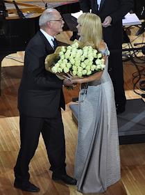 Председатель Союза кинематографистов России, режиссер Никита Михалков (слева) и певица Валерия (справа) на творческом вечере "Территория любви. Сентиментальное путешествие по фильмам Никиты Михалкова через музыку Эдуарда Артемьева". Вечер прошел в Московском международном Доме музыки.