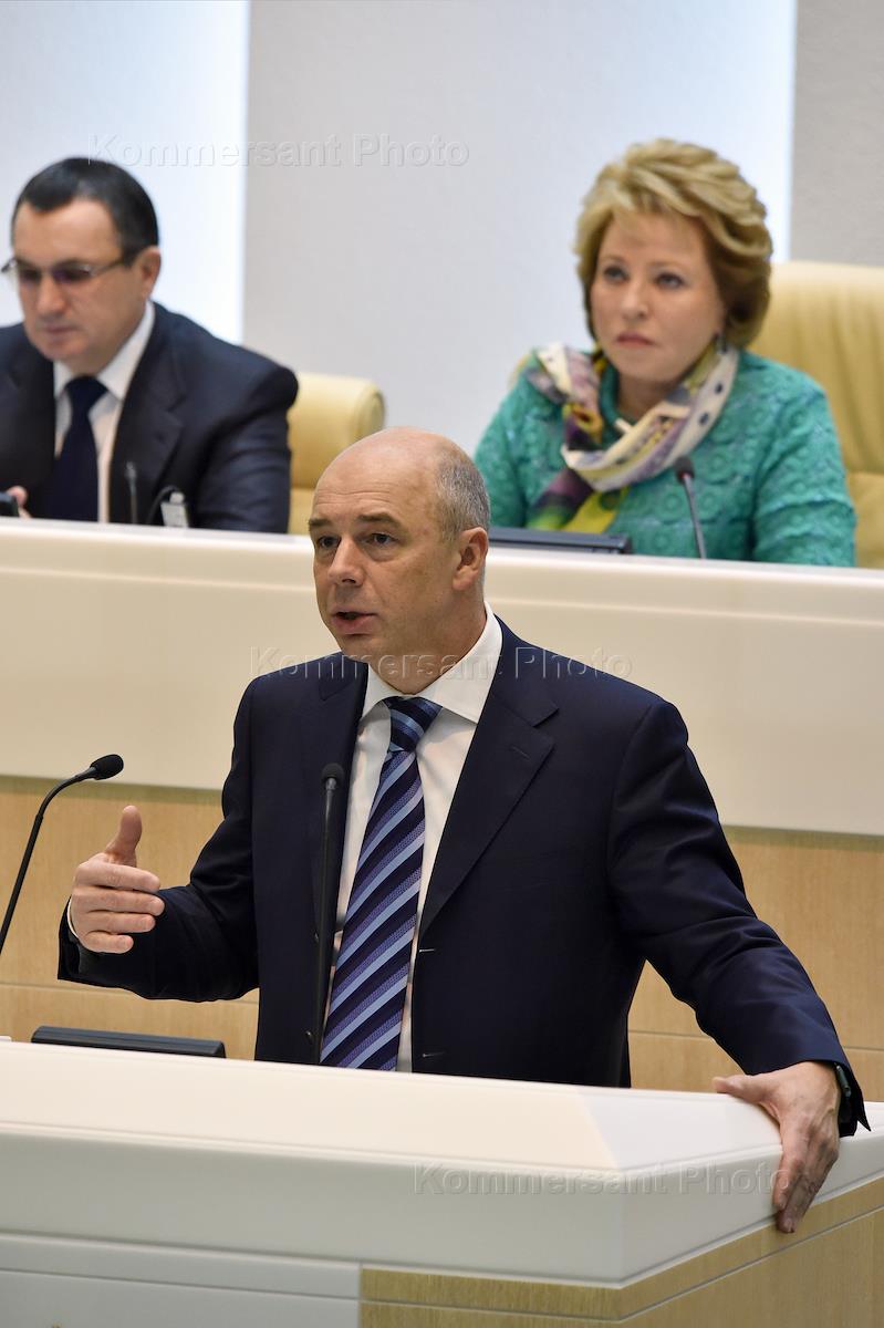 Парламентские слушания, посвященные параметрам проекта федерального бюджета на 2016 год и прогнозу социально-экономического развития России до 2018 года, прошли в Совете Федерации России. Слева направо: представитель законодательного собрания Чувашской республики в Совете Федерации России Федоров, министр финансов России Антон Силуанов, председатель Совета Федерации России Валентина Матвиенко во время слушаний.