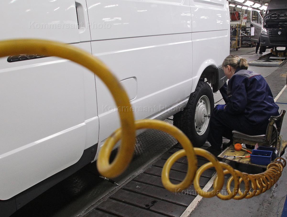 Главный конвейер Горьковского автозавода ОАО "ГАЗ". Рабочие собирают цельнометаллический фургон "ГАЗель Next".