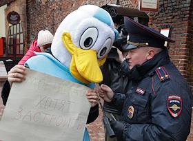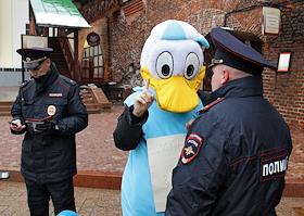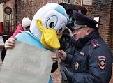 Участник одиночного пикета в костюме утки беседует с сотрудниками полиции.