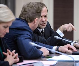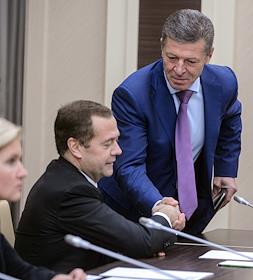 Председатель Правительства России Дмитрий Медведев (слева) и его заместитель Дмитрий Козак (справа) на заседании правительства России.
