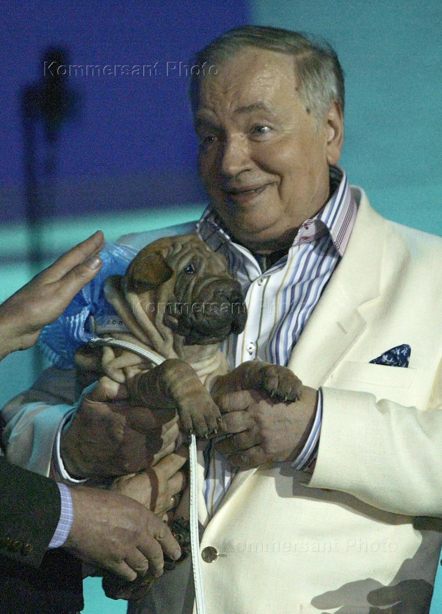 Поэт Андрей Вознесенский с собакой на руках перед выступлением на своем творческом вечере в концертном зале имени Чайковского.