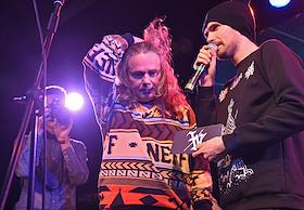 XVI Церемония вручения независимой музыкальной премии "Золотая горгулья" прошла в клубе "16 тонн". Лидер группы "Чиж и Ко" Сергей Чиграков (слева) и рэп-исполнитель Noize MC (справа) во время церемонии.
