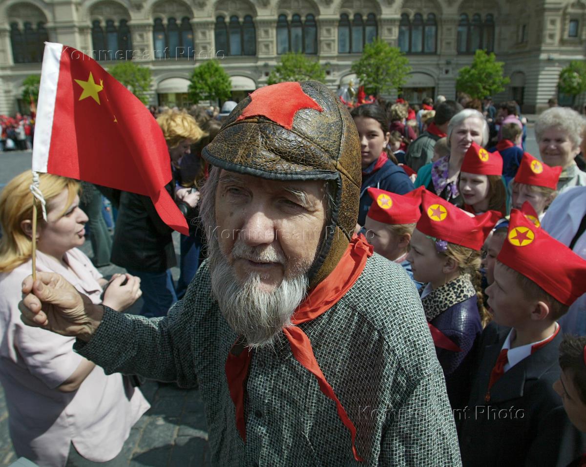 Пожилой человек в красном галстуке и буденовке с красной звездой на торжественной линейке, посвященной 81-й годовщине пионерской организации. Торжественная линейка прошла на Красной площади.