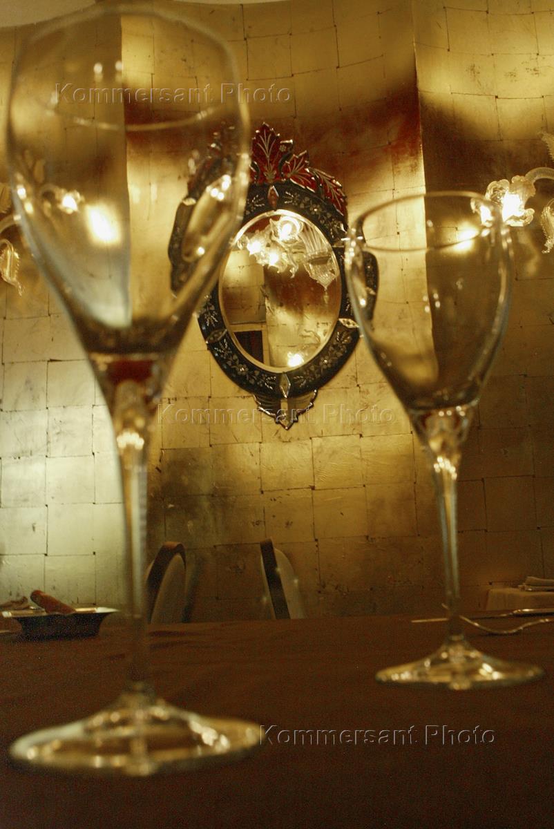 Interior of the Avenue Martell Restaurant - wine-glasses under a lamp.