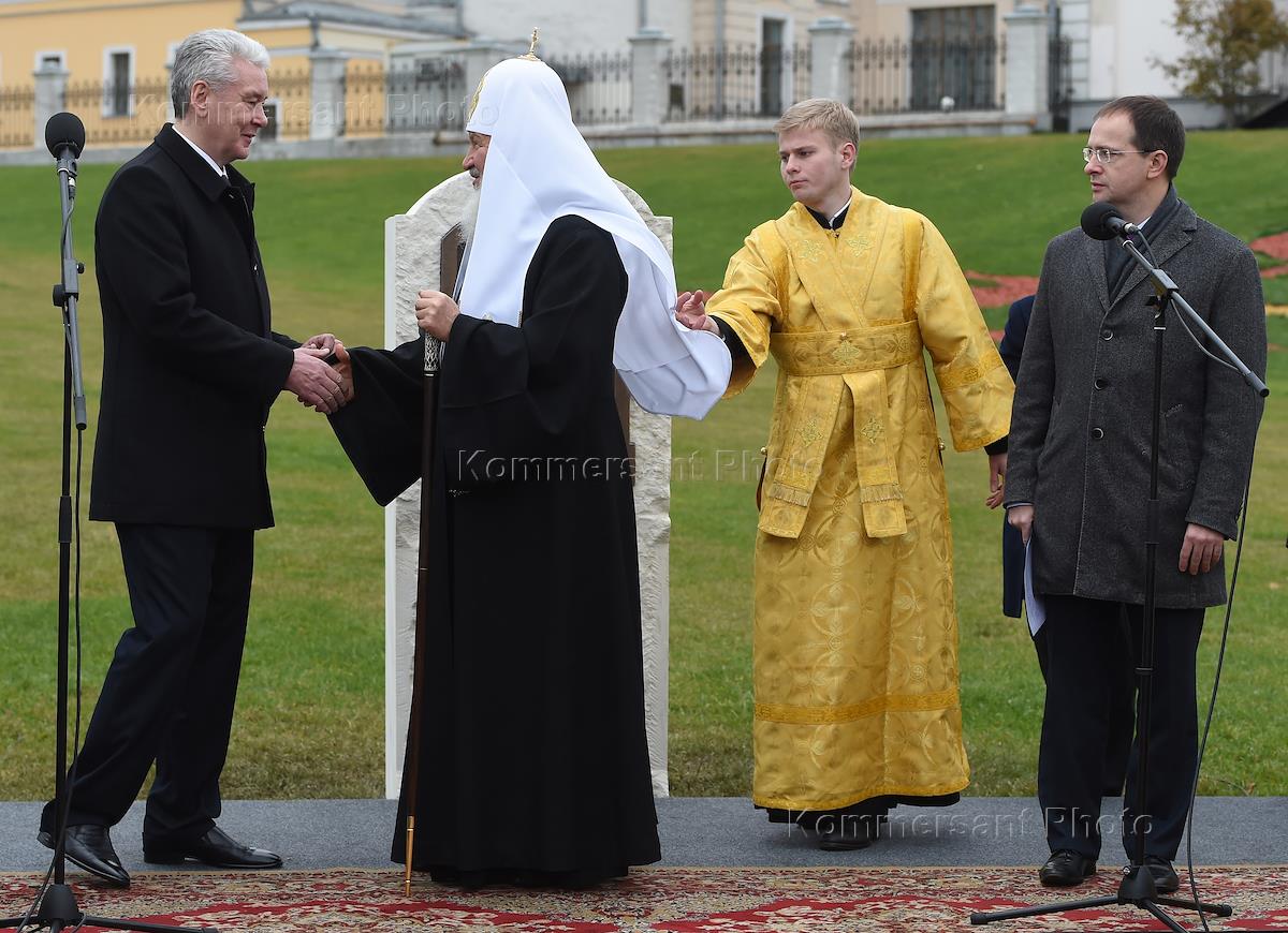 Мэр Москвы Сергей Собянин (слева), патриарх Московский и всея Руси Кирилл (второй слева), министр культуры России Владимир Мединский (справа) во время церемонии открытия закладного камня на месте установки памятника святому равноапостольному князю Владимиру на Боровицкой площади.