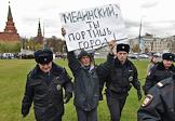 Церемония открытия закладного камня на месте установки памятника святому равноапостольному князю Владимиру прошла на Боровицкой площади. Сотрудники полиции во время задержания мужчины с плакатом "Мединский ты портишь город".