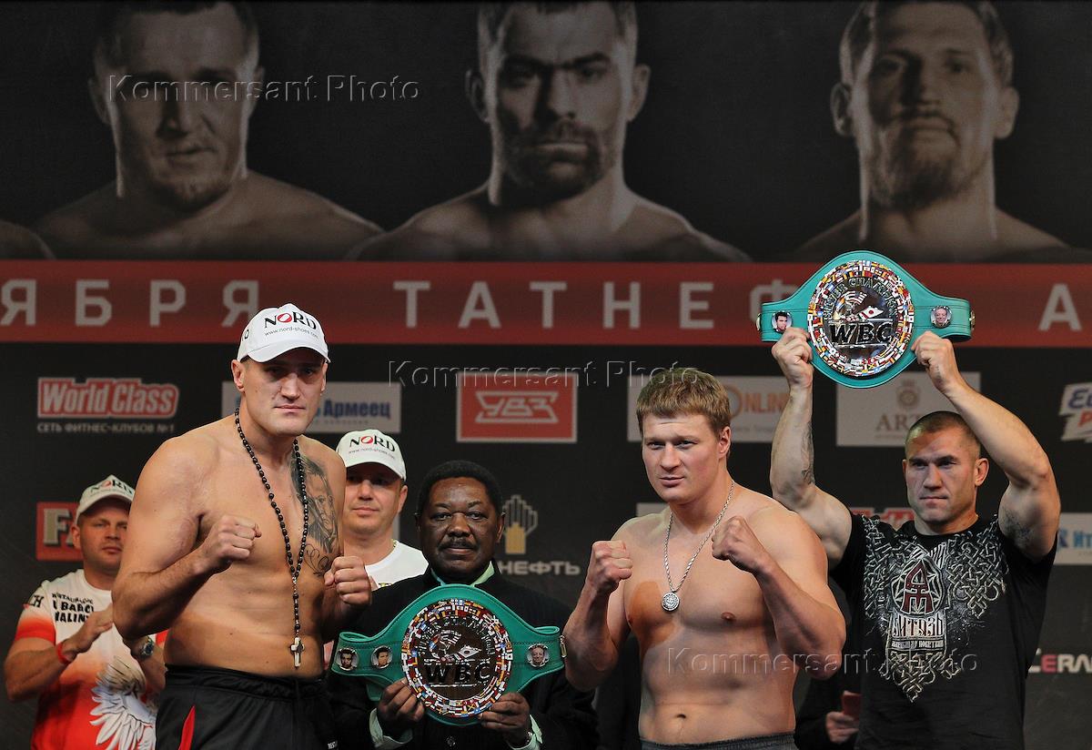 Официальная процедура взвешивания участников "Боксерского шоу" в Казани. Боксер из России Александр Поветкин во время взвешивания.