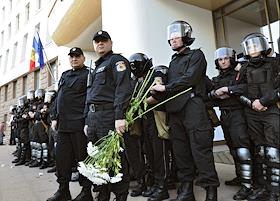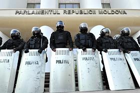 Антиправительственный митинг в центре Кишинева. Сотрудники полиции во время дежурства и оцепления места проведения митинга у здания Парламента Молдавии.