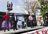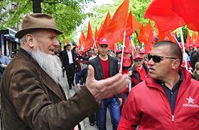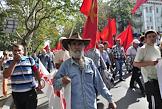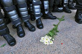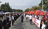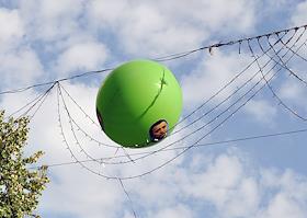 Антиправительственный митинг в центре города. Воздушный шар на электрических проводах.