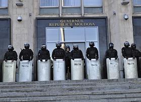 Антиправительственный митинг в центре Кишинева. Сотрудники полиции во время дежурства и оцепления места проведения митинга у здания парламента Молдавии.