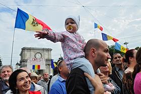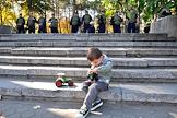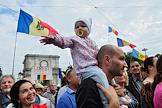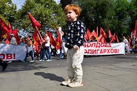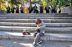 Антиправительственный митинг у здания Парламента Молдавии. Ребенок сидит на ступенях лестницы.