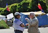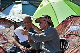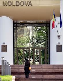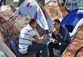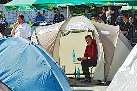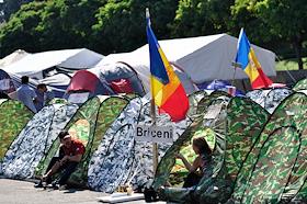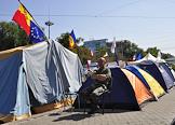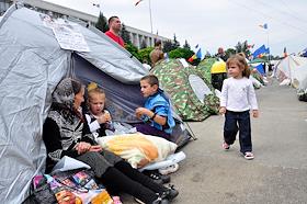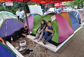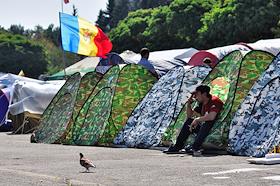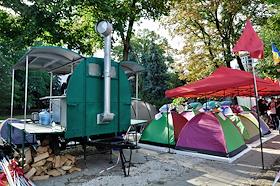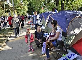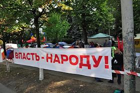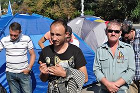 Участники акции протеста против политики нынешних властей в палаточном городке у входа в здание кабинета министров Молдавии.