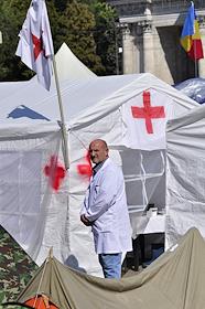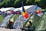 Акция протеста в палаточном лагере участников антиправительственного митинга в центре Кишинева. Сотрудники полиции в оцеплении в лагере.