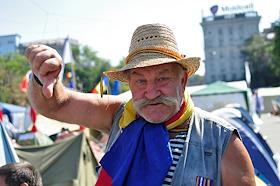 Участник акции протеста против политики нынешних властей в палаточном городке у входа в здание кабинета министров Молдавии.
