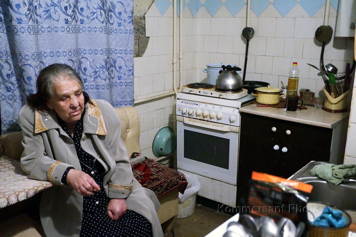 Мероприятия по взысканию задолженности по оплате за бытовой газ с жильцов квартир с участием службы судебных приставов и ООО "Газпром межрегионгаз Пермь". Житель квартиры на кухне, после установки на газовой трубе устройств, блокирующих подачу газа.