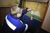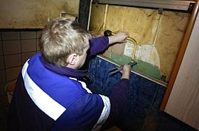 Мероприятия по взысканию задолженности по оплате за бытовой газ с жильцов квартир с участием службы судебных приставов и ООО "Газпром межрегионгаз Пермь". Работник газовой службы устанавливает заглушку на газовой трубе для блокировки подачи газа.