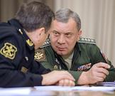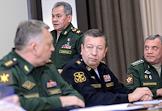 Совещание, посвященное проблематике оборонно-промышленного комплекса. Слева направо: министр обороны России Сергей Шойгу, начальник Генерального штаба Вооруженных сил России, первый заместитель министра обороны России, генерал армии Валерий Герасимов и начальник главного оперативного управления Генштаба ВС России, генерал-полковник Андрей Картаполов во время совещания в резиденции "Бочаров ручей".