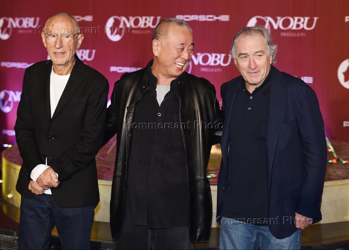 Церемония открытия японского ресторана сети Nobu в торговом центре "Крокус Сити Молл". Слева направо: партнер сети ресторанов Nobu Мейер Тепер, совладелец и шеф-повар сети ресторанов Nobu Нобу Матсухиса, американский актер, совладелец сети ресторанов Nobu Роберт Де Ниро на церемонии.