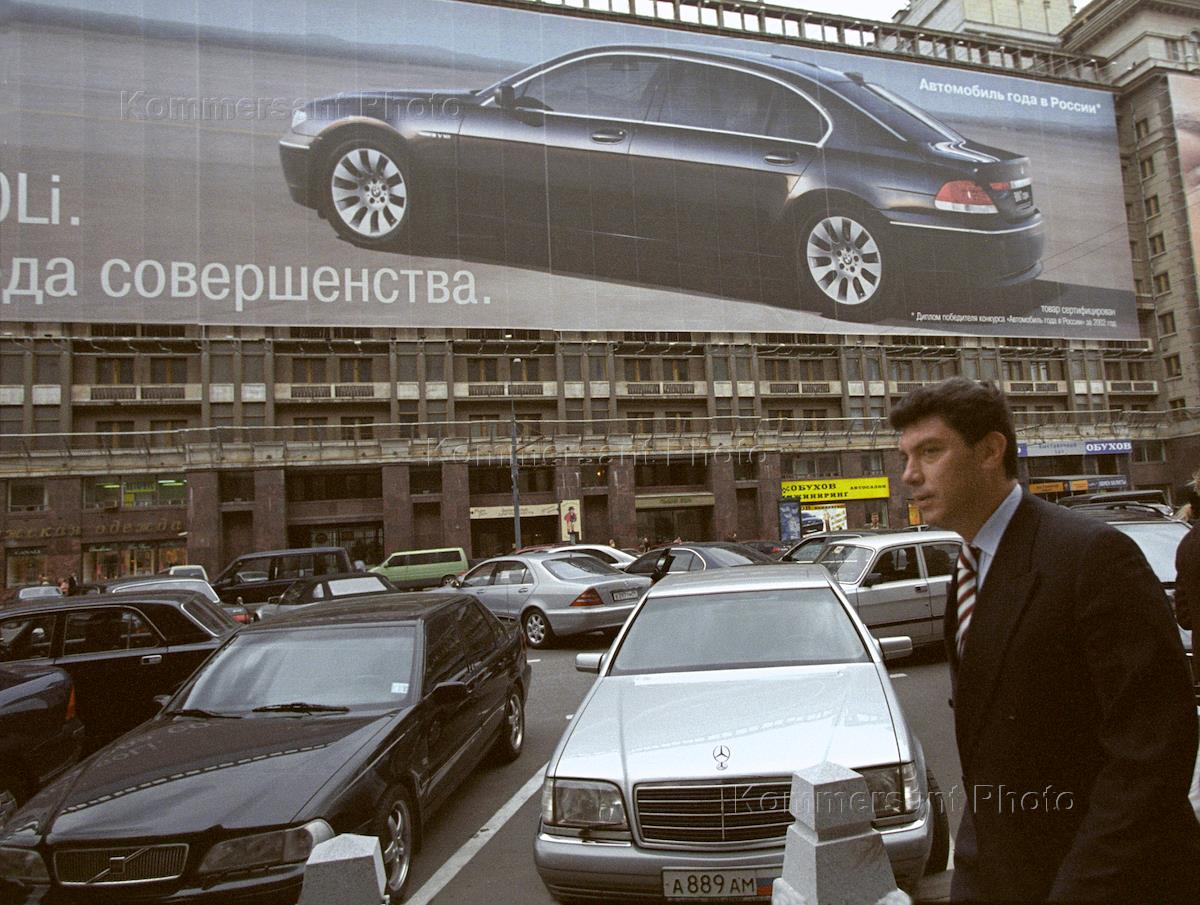 Leader of the State Duma 'Union of the Right Forces' (SPS) faction Boris Nemtsov heads for the Moscow Lomonosov University (MGU) to meet the students of the MGU Journalism School.