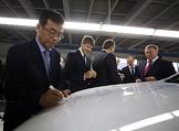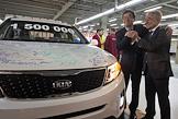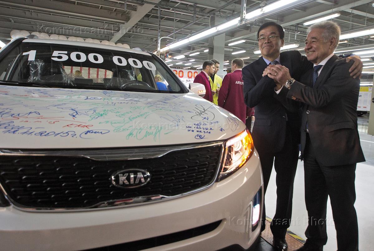 Президент Kia Motors Rus Сонг Хван Ким (слева) во время церемонии выпуска 1,5-миллионного автомобиля "Киа Соренто" с конвейера калининградского завода "Автотор".