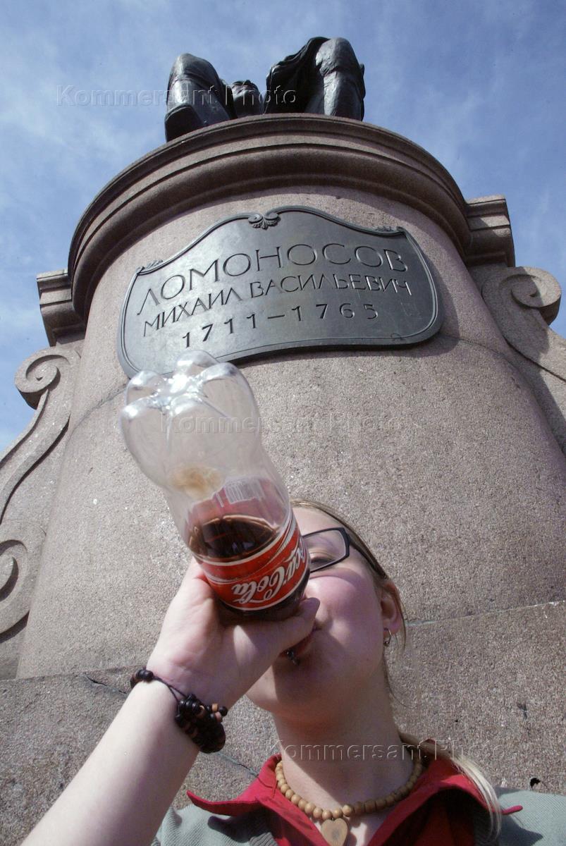 Памятник русскому просветителю, ученому и поэту Михаилу Васильевичу Ломоносову у здания факультета журналистики Московского государственного университета (МГУ). Девушка студентка пьет из пластиковой бутылки Coca-Cola (Кока-кола).
