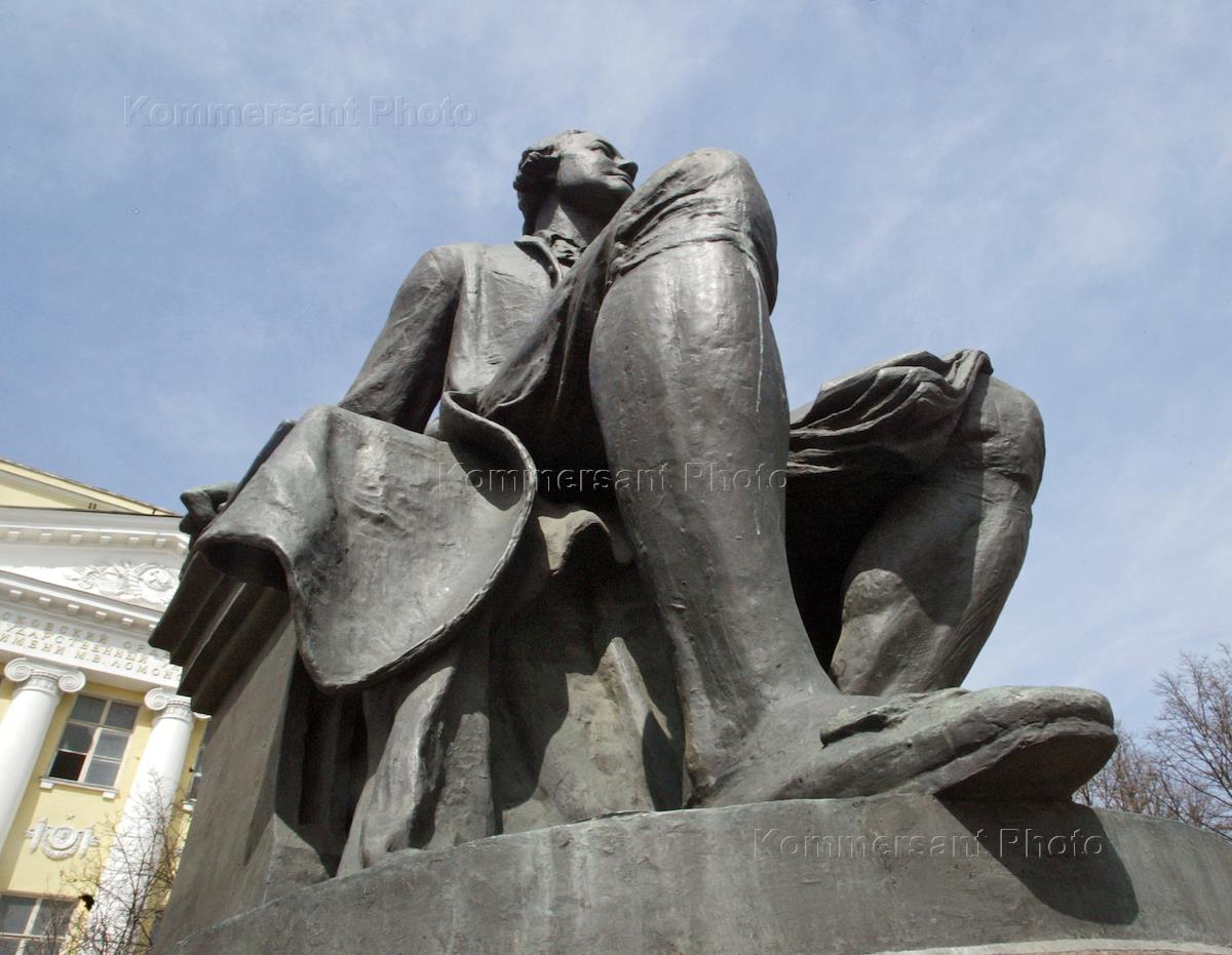 Памятник русскому просветителю, ученому и поэту Михаилу Васильевичу Ломоносову у здания факультета журналистики Московского государственного университета (МГУ).