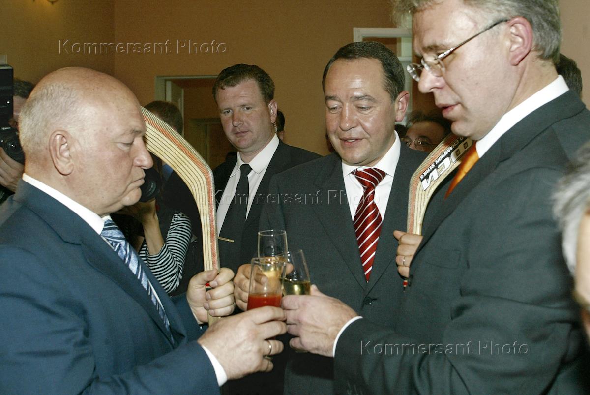 Министр России по делам печати, телерадиовещания и средств массовых коммуникаций Михаил Лесин (слева) и мэр Морсквы Юрий Лужков (справа) на пресс-конференции ВГТРК Госкомспорт: "Создание государственного телеканала".